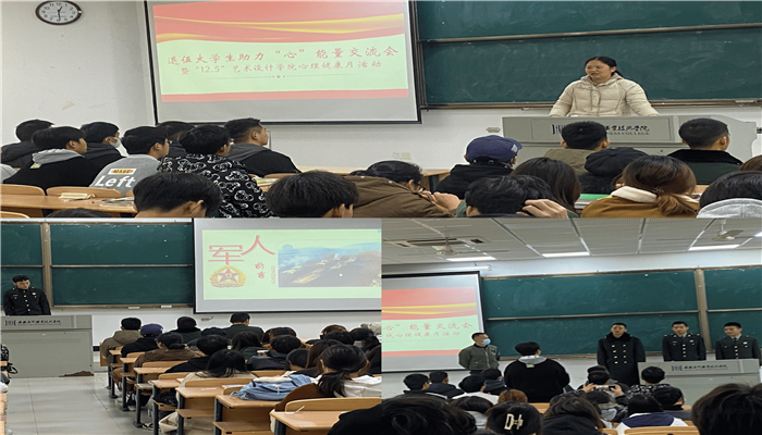 榜样的力量最给力,身边的典型最有型。为多途径发挥退伍大学生的“朋辈引领”作用,助力退伍大学生永葆军人本色,艺术设计学院在心理健康活动月期间举行退伍大学生助力“心”能量个人分享活动,邀请退伍大学生分享自己的军旅生涯,入伍前的自己与入伍后的自己,通过部队锻炼提升了什么、学到了什么。数媒225班胡俊同学分享了自己通过什么方式提升自信心、毅力,如何认真并且付出努力,以及最后获得的成功。建筑211班段玉同学说,两年的部队锻炼了他坚强的意志力,也让他对自己的未来有了更明确的规划,他说“不逼自己一把,你就不知道自己有多优秀”,勉励退伍同学尽快找准人生航向,在新的训练场上建功立业。此次分享交流也让所有同学明白,人生就是一个不断突破自我的过程。