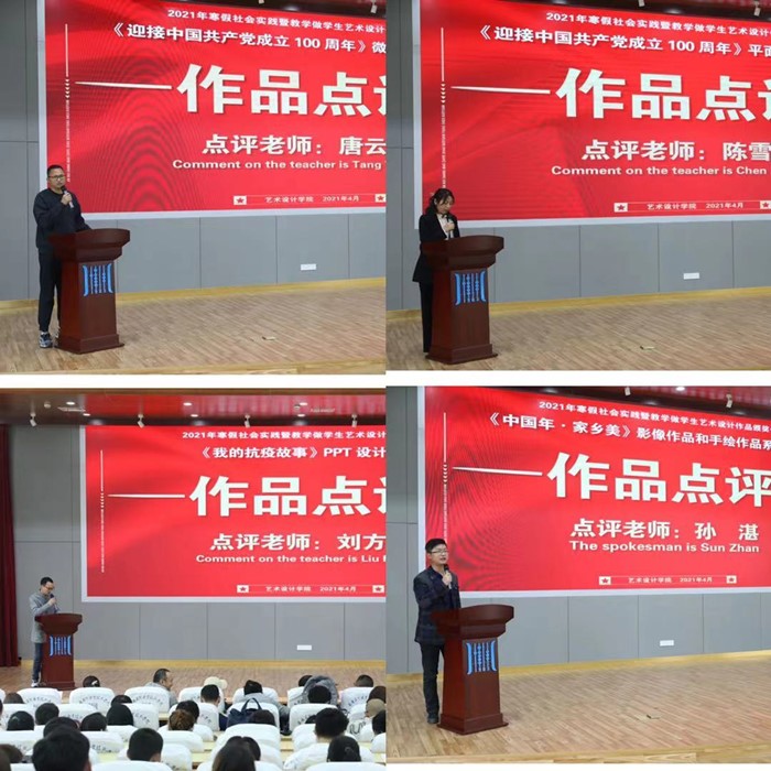 颁奖大会在艺术设计学院党总支书记韩飚的致词中拉开帷幕,按照寒假社会实践活动的各个项目,分作品分享和颁奖两个环节进行。在分享环节中,《我的抗疫故事》PPT设计大赛《中国年·家乡美》影像作品和手绘作品比赛《迎接中国共产党成立100周年》微视频和平面作品制作比赛等获一等奖作品的作者登台展示了自己创作的作品,并向全体师生介绍了自己的创作构思;刘方义、孙湛、陈雪影、唐云龙等教师现场对作品进行了点评。韩飚、吴昊等学院班子成员及各教研室主任为获奖学生颁奖,郑伟、黄义兵、杨卫宏等嘉宾分别为获奖班集体、优秀指导教师、优秀辅导员颁奖。整个颁奖活动简朴而隆重,师生们在思想建设、课程思政、专业技能应用、两个课堂的结合、学习方式等方面进行了有益的交流。