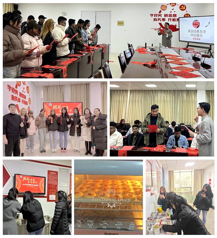 现场留学生们在路贺龙、许美珏两位老师的指导下,学习书法知识、学写春联龙“福”、感受书法魅力,收获属于自己的定制版春联。跟随路贺龙老师的指导,共同品鉴诵读古诗《元日》,在朗朗读书声中感受新春气象。留学生们在周园园和许明星老师的讲解中了解春节传统和民俗文化,气氛热烈。王倩倩、汪小芳老师带领留学生一起动手烘焙新年糕点,师生一同备材料、制面糊、做装饰,体验动手实践的过程,品尝手工制作的糕点,品味劳动的美好滋味。