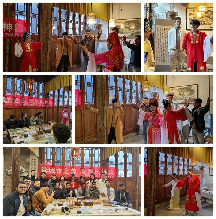为了立足群体和地域特点,设计了城市文化主题美劳活动。学院副院长王松林和相关教师带领留学生走进芜湖古城知我茶社。品茶道、学茶礼,留学生们在茶艺师的指导下了解中国茶文化的历史,以及品茶、冲泡、茶具品鉴等茶知识。留学生们尝试沏茶、闻茶、品茶,体会茶文化的精妙之处。走台步、唱念白,留学生们身着戏曲服装,跟随戏曲演员学习黄梅戏和越剧的身形、步法,汲取了戏曲知识,零距离体验中国戏曲的魅力。留学生们激动地说“春节是中国最重要的节日,学戏、品茶、写书法,对我来说都是全新的体验。”