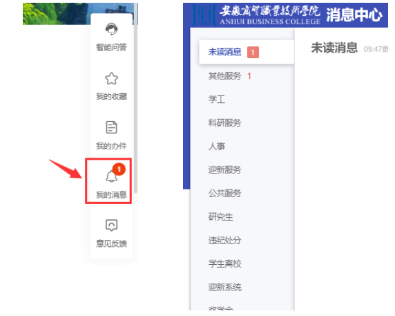 在右侧任务栏,点击“我的消息”,可查看各业务系统的消息通知。