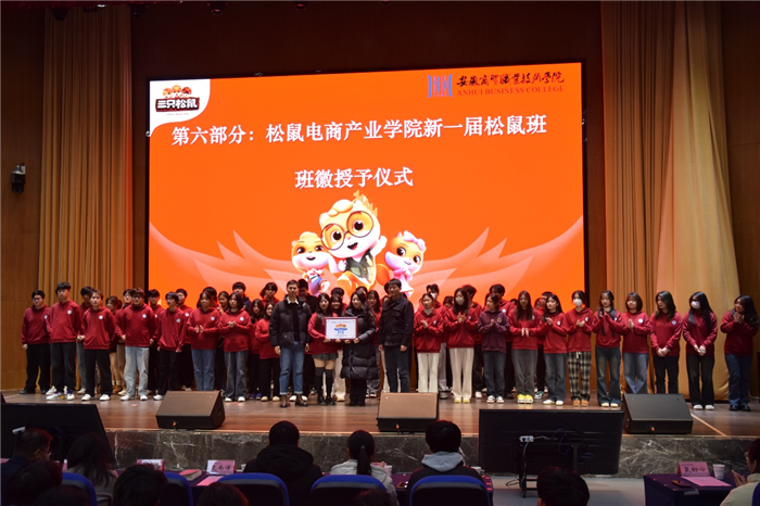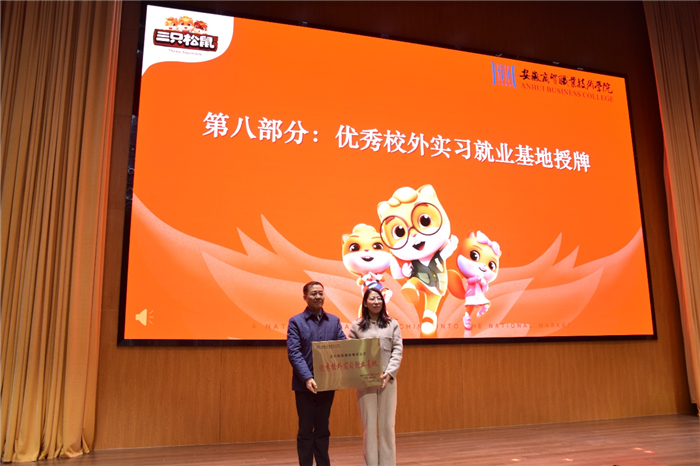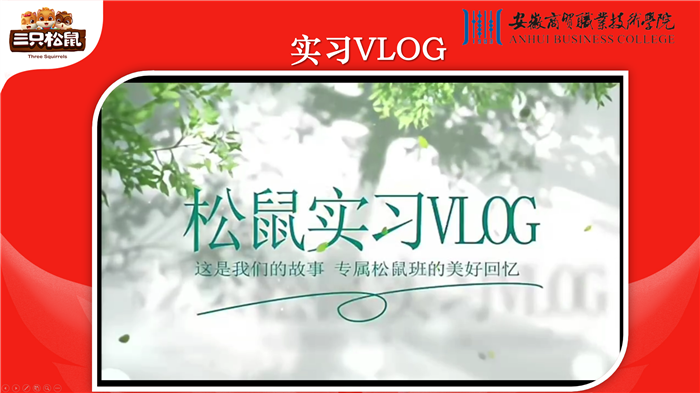 松鼠产业学院221班同学们自发设计并制作了实习短视频VLOG,共同记录并回忆在松鼠实训的美好瞬间。表彰典礼上,校企双方领导为表现优异的“优秀实习生”颁发了证书和奖品。随后校企双方举行了松鼠电商产业学院231松鼠班班徽授予仪式和优秀校外实习就业基地授牌仪式。
