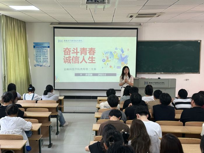6月2日,金融科技学院邀请金融服务与管理教研室许贤丽老师给大家做了一场主题为“奋斗青春,诚信人生”的诚信金融知识讲座。许贤丽从大学生的日常学习生活和专业知识两个层面对诚信的重要性予以剖析,本场讲座内容丰富,紧扣大学生的日常生活,从现实案例分析、诚信的重要意义、当代大学生的诚信现状、当代大学生诚信缺失的原因以及当代大学生如何树立诚信五个方面进行逐一讲解,同学们听后都觉得受益匪浅,收获良多,都表示在日后的学习和工作中立志诚信于事,诚信于人,充分展现了金融科技学院学子诚实做人、诚信做事的决心。