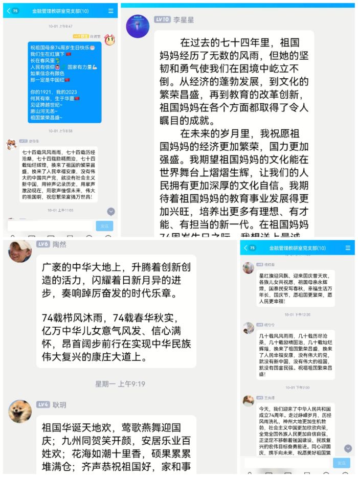 为庆祝中华人民共和国成立74周年,进一步弘扬以爱国主义为核心的民族精神和以改革创新为核心的时代精神,推进学习贯彻习近平新时代中国特色社会主义思想主题教育走深走实,增强党组织和党员教师不忘初心、实干担当、奋发有为的自觉性、主动性和创造性,金融管理教研室党支部组织开展“重温红色记忆 赓续革命精神 凝聚奋进力量 我为祖国妈妈送祝福”系列主题党日活动。
