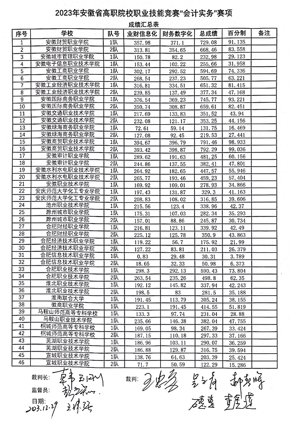 我院承办的2023年安徽省职业院校技能大赛会计实务赛项于2023年12月29日结束,现将比赛成绩予以公示。