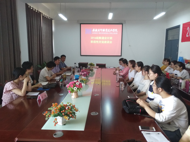 随着“大、智、移、云”对行业发展的深入影响,会计系能够及时把握行业脉搏,在专业建设上展开积极探索,本年度会计系第三届互联网会计订单班——北京账道会计班开班运行已有2个多月,为进一步掌握账道会计班学生的培训、实践等学习情况,也便于后期账道会计班教学活动有针对性的开展,借助学校召开第二届校企合作理事会暨专业建设指导委员会会议契机,5月16日中午,会计系召开了2016级账道会计班全体同学座谈会,来自北京账道会计管理公司总经理张梅玲、公司驻点指导老师李培出席了会议,一同参会的还有会计系主任王珠强、系副主任鲁学生,教研室主任赵春宇、曹方林、教学秘书凤麟、班级辅导员弋兴飞以及2016级账道班全体同学。
