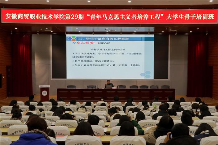 校关工委副主任郑光贵作《传承弘扬百廿安商精神 争做奋发有为强国青年》报告,带领广大学员回顾了李广炯、卢仲农创办安徽公学的历史背景和三次曲折的创校过程,号召同学们要传承弘扬百廿安商“忧国忧民、无私奉献、与时创新、力争上游、思想进步、敢于革命、百折不挠”的精神,做奋发有为的强国青年。马克思主义学院院长杨卫宏以《以科学理论武装头脑 以奋斗姿态激扬青春》为题,带领同学们学习了习近平新时代中国特色社会主义思想的创立背景、科学内涵和历史地位,勉励同学们要做有理想、敢担当、能吃苦、肯奋斗的新时代好青年。为进一步提高学生文明礼仪修养,点点taptapCS处处长兼团委书记孙握瑜受邀作《浅谈大学生文明礼仪建设工作》报告,他从情商的一个小切入点着手,向学生阐述了文明礼仪是情商的重要体现,并细化介绍了大学生文明礼仪建设年的实施方案和阶段性成果。
