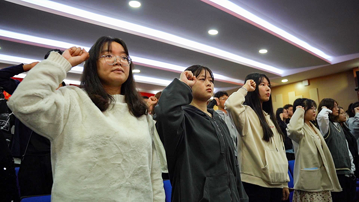 活动最后,全体团员在许周涵同学的带领下重温入团誓词,“我志愿加入中国共产主义青年团,坚决拥护中国共产党……”同学们高举右拳,庄严宣誓,嘹亮的声音响彻整个会场。
