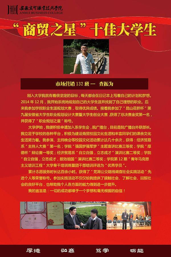 各系部参照《关于开展首届“商贸之星”十佳大学生评选工作的通知》文件精神,严格按照评审条件和程序,认真做好参评事迹的整理和推荐工作,确保评选工作公平、公开、公正。经过各班级申报、系部初评,共推报27名候选人。候选人经过网上投票、学院评审等环节最终评选出查振为等10名同学荣获“商贸之星”十佳大学生荣誉称号。