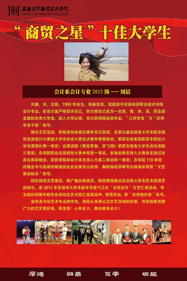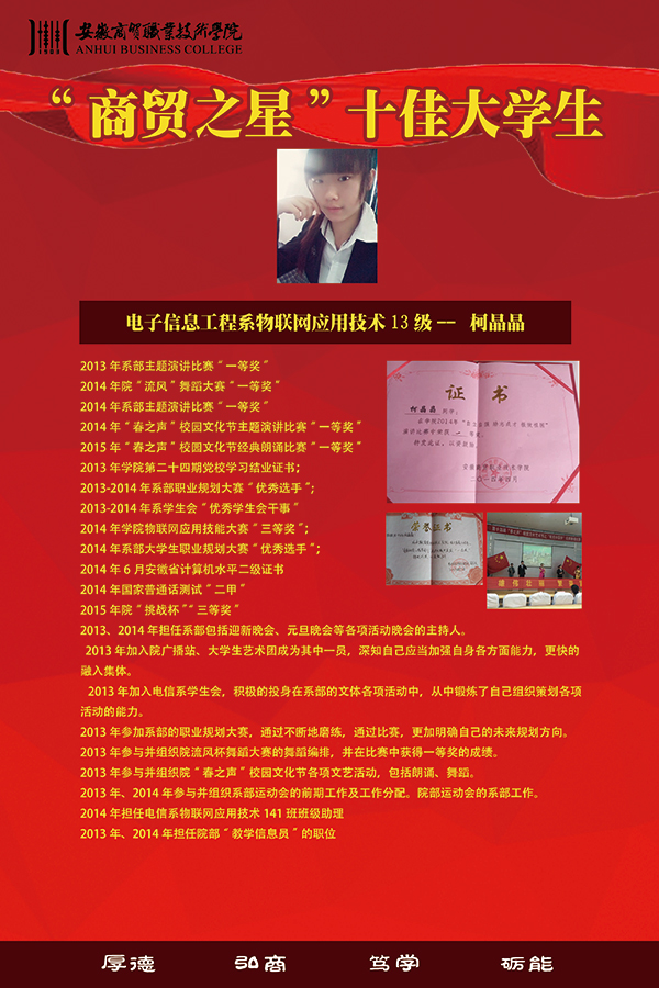 10名优秀同学积极进取,在道德示范、专业学习、科技创新、社会实践、志愿服务、自主创业、自强奋斗、环境保护、文艺创作和体育锻炼等方面事迹突出,自身思想素质、专业素质、人文素质、能力素质等培养方面堪为学生典范,对商贸学子起到了重要的示范和导向作用。