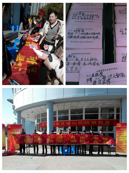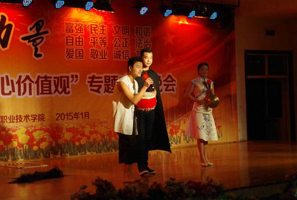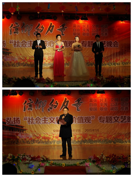 自开展社会主义核心价值观活动以来,在院党委的组织领导下,团委、各团总支、各学生组织共同协作,开展一系列丰富多彩的实践活动,积极践行社会主义核心价值观,加强宣传教育。晚会前在《社会主义核心价值观之歌》雄壮的歌声中,通过专题幻灯片回顾了团委、各团总支、各学生组织开展的活动图片。歌声、图片的烘托使得整个会场充满了正能量。