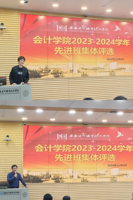 为进一步培养良好班风班貌,充分发挥先进班集体的示范引领作用,进一步激励全院学生不断积极进取、拼搏向上,11月6日晚,会计学院2023-2024学年度先进班集体评选汇报会在学校录播室举行。会计学院党总支书记王珠强、院长鲁学生、办公室主任程慧、教学秘书弋兴飞、会计教研室主任郑兴东、会计信息管理教研室主任曹方林以及2024年世界职业院校技能大赛会计实务组(赛项)全国金奖第一名指导老师姜晨共同担任本次活动的评委。各候选班级代表、辅导员老师以及部分学生代表也参加了此次会议。