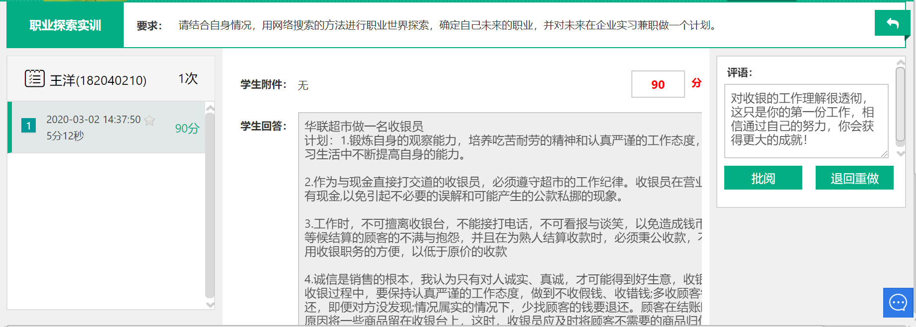 2.“职教云”布置作业,复习巩固。教师在“职教云”布置作业,学生发送附件提交作业,教师批改作业并打分。作业布置分两种形式:个人作业和小组作业。个人作业难度不大,要求每位同学都独立完成,培养独立思考钻研精神;小组作业,有一定的难度,且有一题多解的形式,培养多角度全方位思考、团队合作精神和助人为乐的优秀品质。