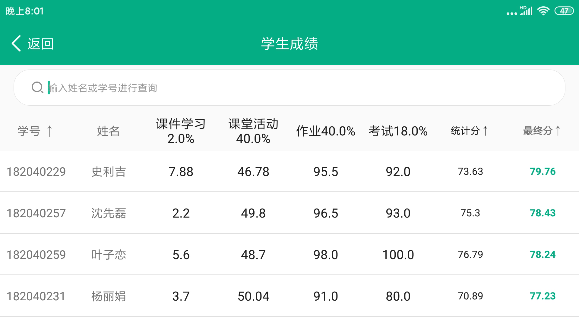 3.教学评价,统计分析学习数据。留存班级及学生的数据统计,便于分析与教学评价。
