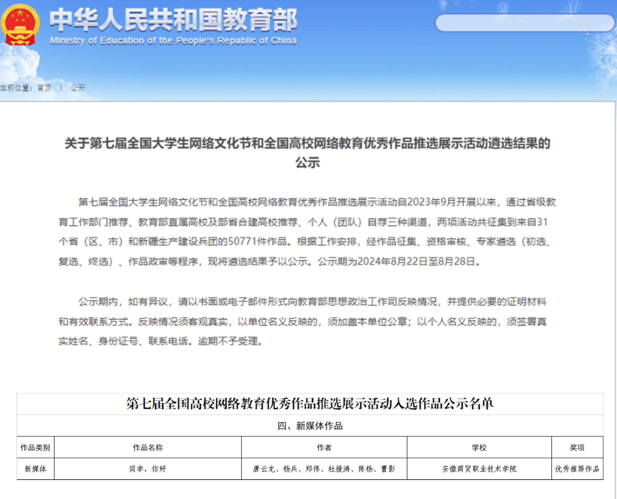 据悉,全国大学生网络文化节和全国高校网络教育优秀作品推选展示活动由教育部思想政治工作司、中央网信办网络社会工作局主办,是全国高校网络思政领域级别最高、覆盖面最广的竞赛之一。第七届全国大学生网络文化节和全国高校网络教育优秀作品推选展示活动以“争做校园好网民,汇聚网络正能量,挺膺担当建新功”为主题,自2023年9月开展,通过省级教育工作部门推荐、教育部直属高校及部省合建高校推荐、个人(团队)自荐三种渠道,两项活动共征集到来自31个省(区、市)和新疆生产建设兵团的50771件作品,我校为安徽省唯一一所高职院校荣获全国高校网络教育优秀作品。