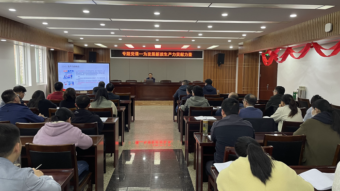为深入开展学习贯彻习近平新时代中国特色社会主义思想主题教育,深化教师党员对生产力发展规律的认识,领悟习近平经济思想内涵,3月27日下午,校党委委员、副院长郑承志结合当前形势,立足本校实际,以“为发展新质生产力贡献力量”为主题给行政第一党总支、行政第二党总支全体党员上主题教育专题党课。