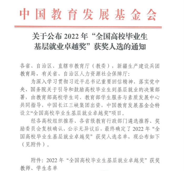 近日,教育部高校学生司、中国教育发展基金会公布了2022年度“全国高校毕业生基层就业卓越奖”获奖人选名单,我校毕业生章亚楠入选。