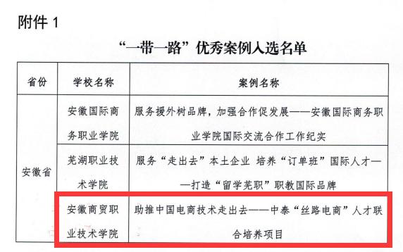 2023年初,中华职业教育社开展了“共建‘一带一路’十年来职业教育合作成果集”优秀案例征集活动,庆祝习近平总书记提出构建“人类命运共同体”和共建“一带一路”倡议十周年。活动按照中办、国办联合印发的《关于推动现代职业教育高质量发展的意见》等文件关于促进职业教育国际化发展的工作要求,发挥“一带一路”沿线国家教育资源互补的积极作用,推动我国职业教育和教育国际合作高质量发展。经省社推荐遴选、评审委员会审议、总社党组审核,9月27日中华职业教育社公布了成果集入选名单,我校案例“助推中国电商技术走出去——中泰‘丝路电商’人才联合培养项目”成功入选。