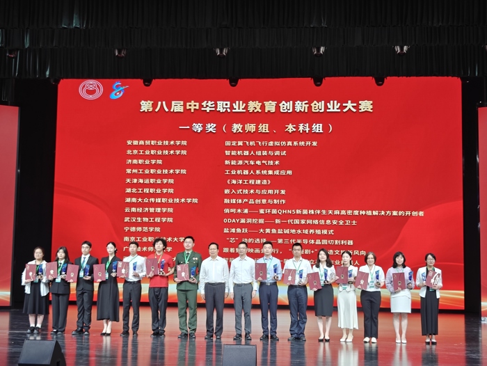 5月30日上午,第八届中华职业教育创新创业大赛全国现场总决赛在湖北黄石圆满落幕。我校江宏、孙握瑜、胡计虎、吴永康四位教师组成的教学团队,在全国130余支教学团队中脱颖而出,凭借现场赛的优异表现,一举斩获一等奖。
