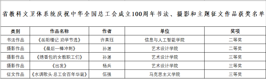 近日,安徽省科教文卫体工会通报了系统开展庆祝中华全国总工会成立100周年书法、摄影和主题征文活动评选情况。我校喜获多项荣誉:信息与人工智能学院许美珏书法作品《岳阳楼记 劝学节选》获二等奖;艺术设计学院孙湛摄影作品《最后一棒冲刺》《绣香包的女教职工们》分获二等奖、三等奖;艺术设计学院杨兵摄影作品《出发》获三等奖;马克思主义学院伍强征文作品《水调歌头·总工会百年华诞》获三等奖。