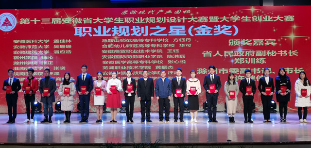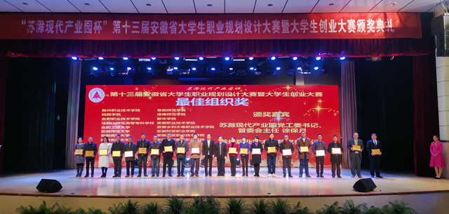 12月9日,省教育厅、省人力资源和社会保障厅、共青团安徽省委主办的“苏滁现代产业园杯”第十三届安徽省大学生职业规划设计大赛暨大学生创业大赛决赛在滁州职业技术学院顺利落幕。我校选送的经济贸易系史鸿根、李鑫磊、姜珊创业团队和人文外语系王钰同学分别获得安徽省大学生创客之星(金奖)和安徽省大学生职业规划之星(金奖),学校再获最佳组织奖。省政府副省长王翠凤参观了大学生创新创业成果展并出席颁奖典礼。省政府副秘书长郑训练,省委教育工委书记钱桂仑,滁州市委副书记、市长许继伟,省教育厅副厅长解平,团省委副书记张敏,省劳动就业服务局局长唐正亮,滁州市政府副市长陆峰等领导出席闭幕式并为获奖选手、单位颁奖。