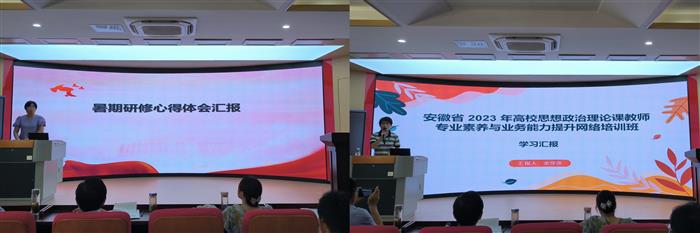 余莎莎与林霁月两位老师参加了安徽省 2023 年高校思想政治理论课教师专业素养与业务能力提升网络培训班。余莎莎老师结合两次参加安徽省教学能力大赛的亲身经历,就教师、教材、教法“三教”问题讲述了自己的见解,林霁月老师结合自身读博的经历与感悟,勉励思政课教师要读经典,以提升个人境界和教学能力;学技术,用现代信息技术赋能思想政治教育;跟前沿,紧跟思想政治教育理论的前沿。